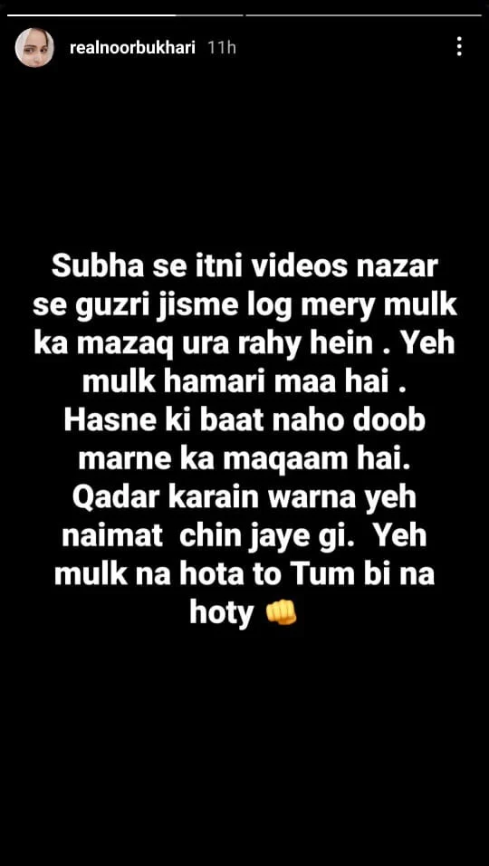 Expressing her anger in the story, she wrote that since morning, she had seen many videos where people were making fun of Pakistan. “This country is our mother; it’s not something to laugh about, it’s something to mourn.”