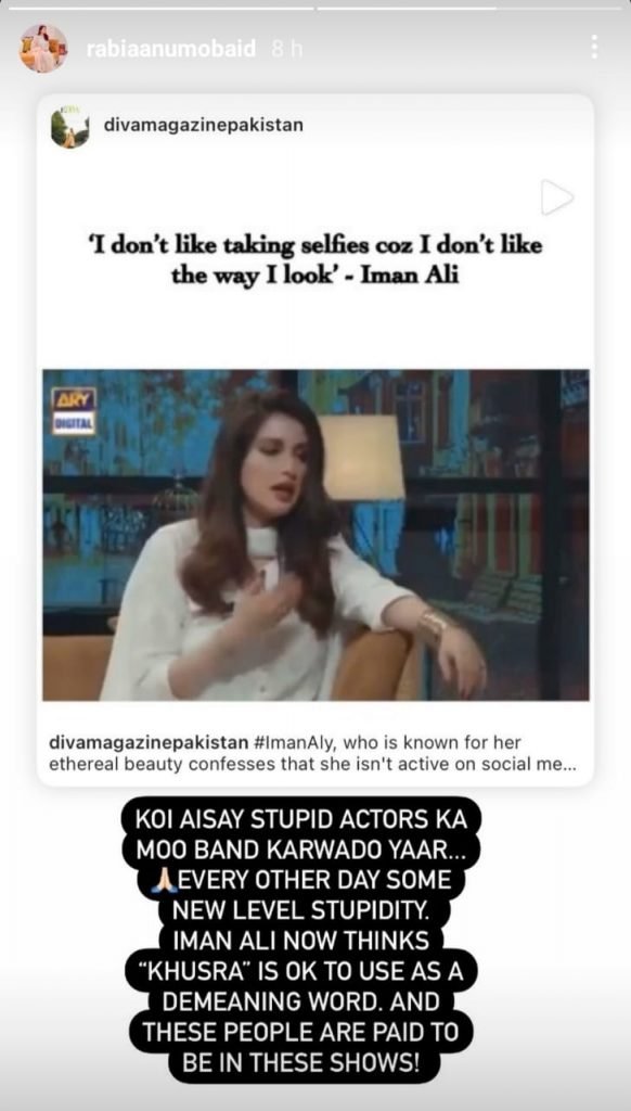 Anum was invited as a guest on Yasir’s show alongside controversial actor Mohsin Abbas Haider. Rabia won public praise when she announced during the show that she was walking off air to show solidarity with domestic abuse survivors.