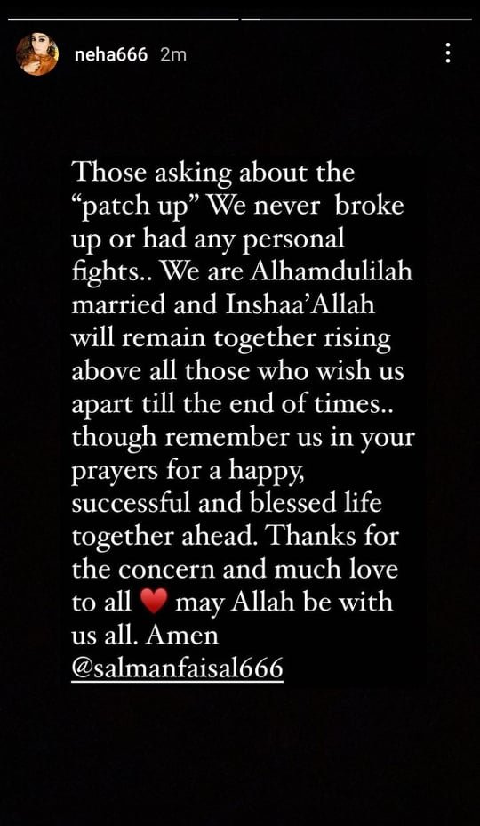 Neha then cleared the air about their alleged separation. She took to Instagram and congratulated her husband on his splendid performance in CPL and the victory of his team ‘Islamabad Nova’.