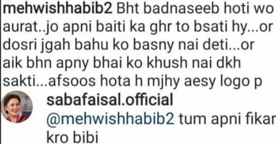 Veteran actor Saba Faisal’s daughter-in-law has posted a series of cryptic posts on her Instagram handle. Netizens are assuming that these posts are targeted at her in-laws with whom she has shared problematic equation in the past.
