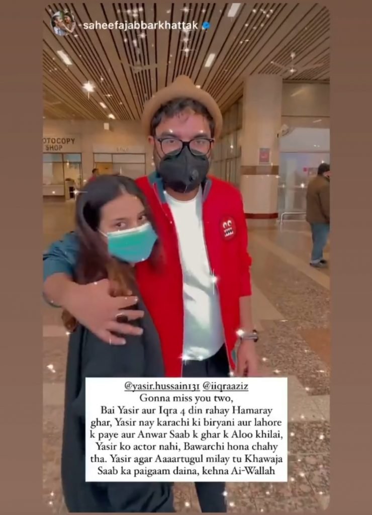 Saheefa Jabbar Khattak, with whom Yasir had stayed with during his time in Lahore, also shared a picture of him and Iqra at the airport while seeing them off and said: “Yasir agar Aaaartugul milay toh Khawaja Saab ka paigaam dena, kehna Ai-Wallah.” Khawaja Sahab is Saheefa’s husband.