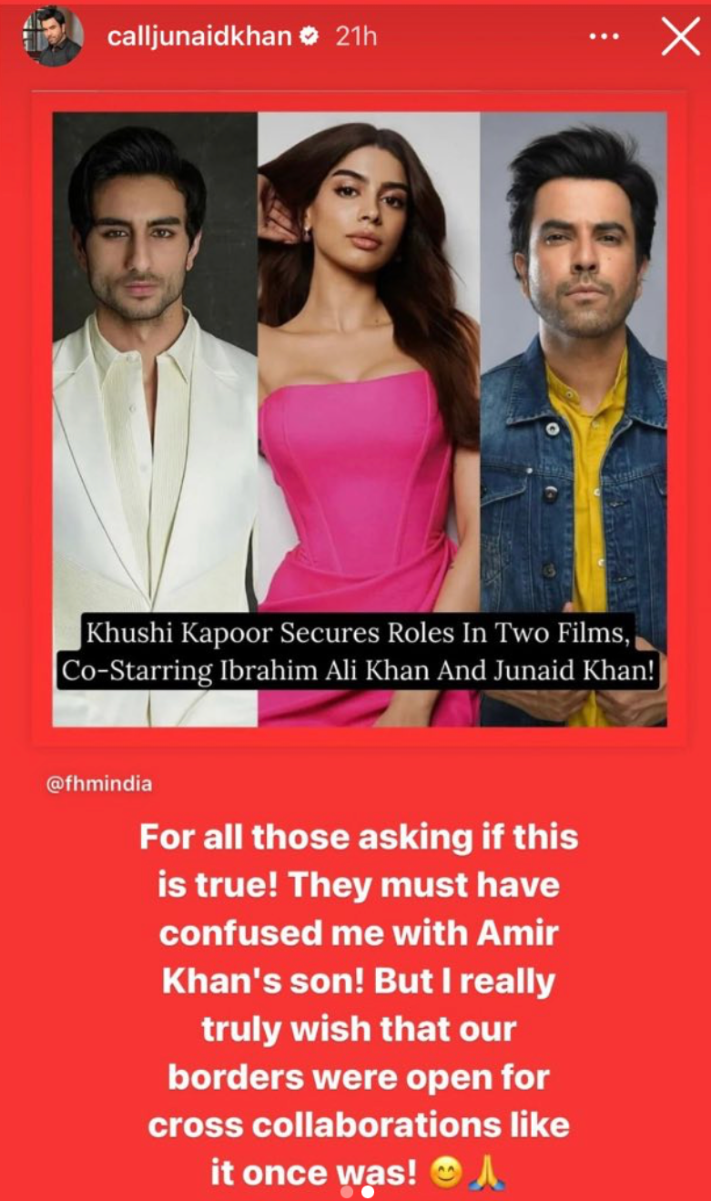 “For all those asking if this is true! They must have confused me with Aamir Khan’s son! But I really truly wish that our borders were open for cross collaborations like it once was!” Junaid said on his IG Stories.