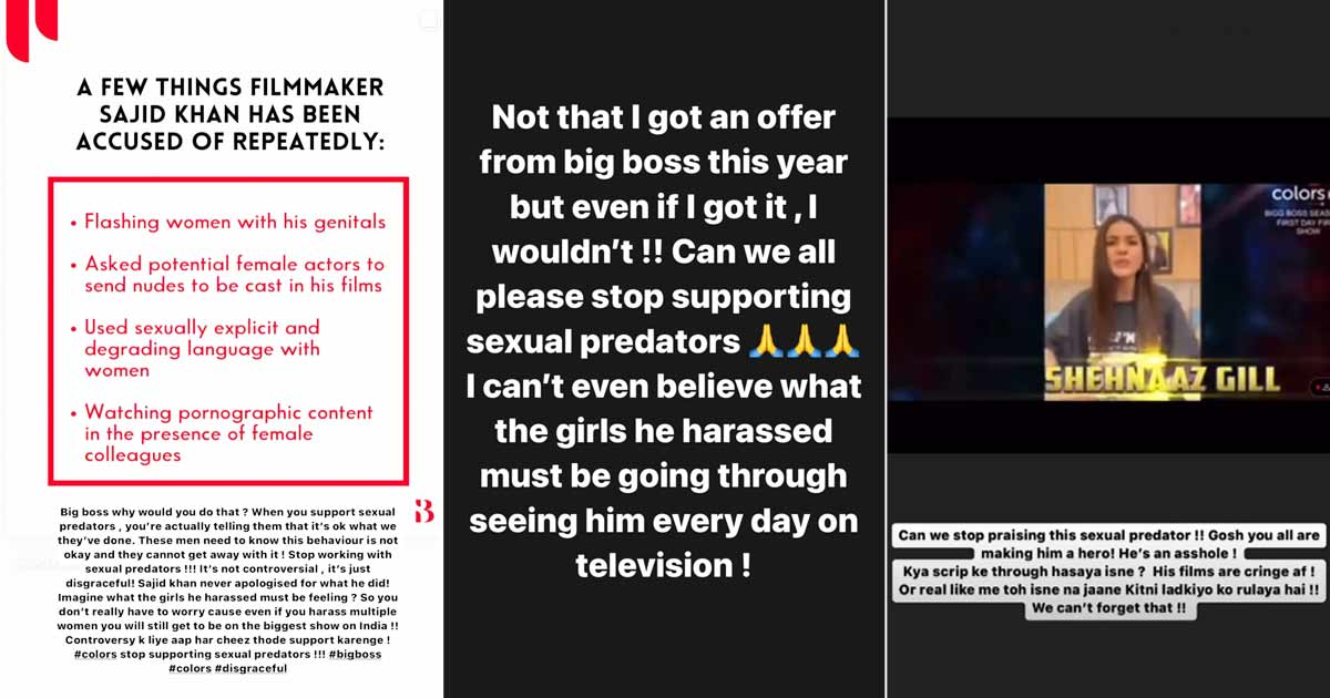Reacting to all of it, Javed took to her Instagram story and wrote, “Big boss why would you do that? When you support sexual predators, you’re actually telling them that it’s ok what we they’ve done. These men need to know this behaviour is not okay and they cannot get away with it!”