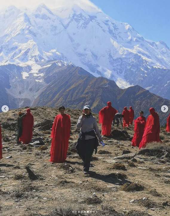 She posted nine photos on Instagram showing the scenic beauty and challenges of filming ‘Barzakh.’ The pictures feature Sanam Saeed against rugged mountains and masked women in red abayas, capturing the essence of the series. She shared her experience of shooting, describing it as magical, challenging, and exhilarating.