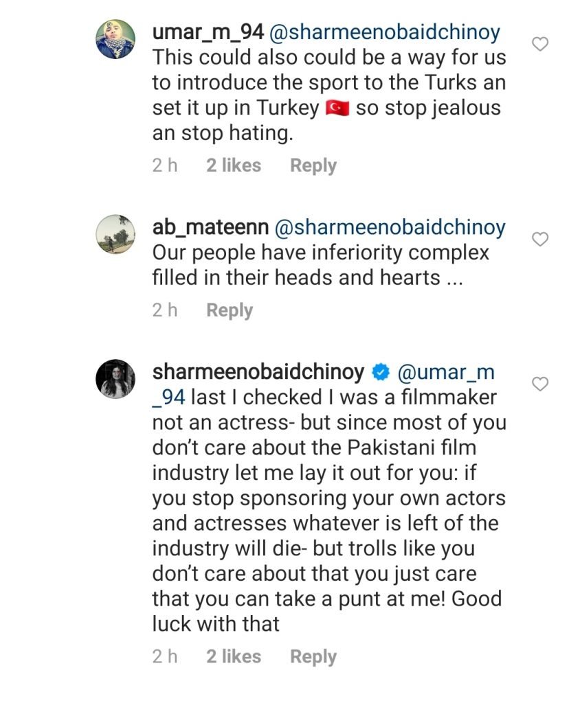 Sharmeen Obaid-Chinoy continues to defend her stance on Turkish actor despite receiving immense backlash and criticism.