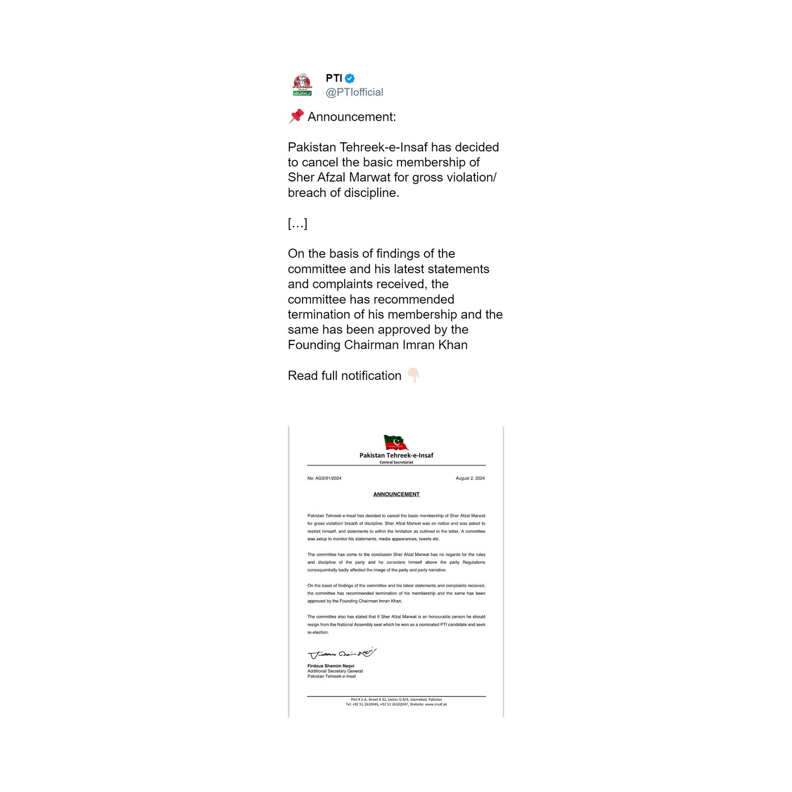 Pakistan Tehreek-e-Insaf’s (PTI) official page on social media platform X, formerly Twitter, announced the cancellation of the basic party membership of maverick leader Sher Afzal Marwat for a “gross violation/ breach” of discipline.