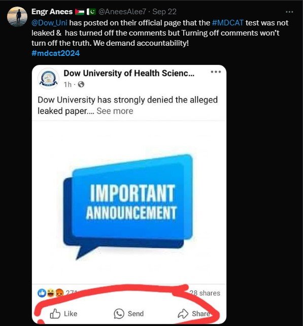 Another student posted a screenshot of the denial of Dow University on Facebook, stating that the comments section was turned off. “Turning comments won’t turn off the truth. We demand accountability,” he stressed.