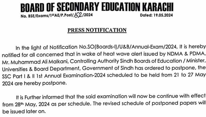 Class 9th and 10th exams have been postponed in Karachi due to a possible heat wave.