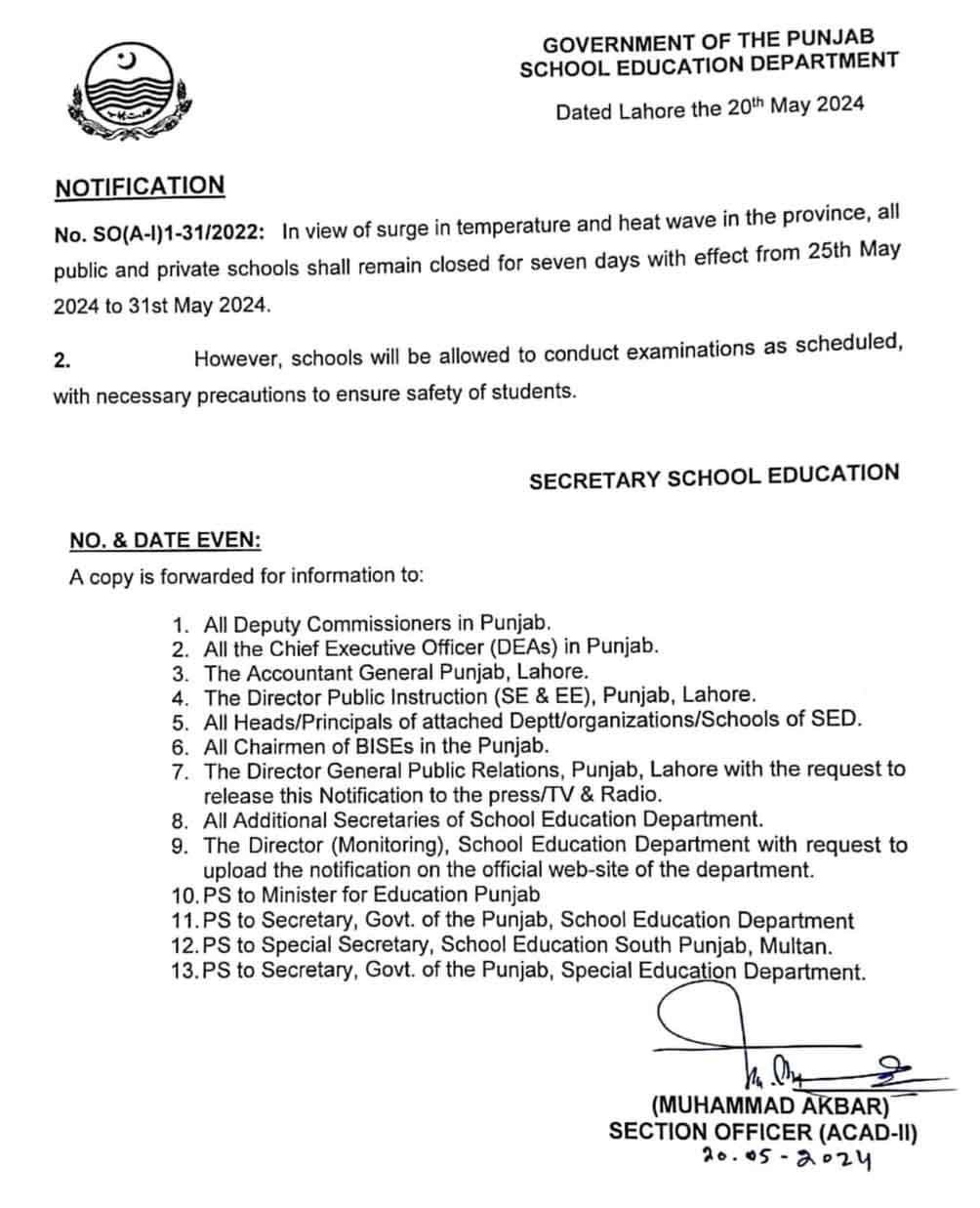A notification issued by the Government of Punjab states that due to the heat wave, a seven-day-long holiday has been announced in schools. Therefore, schools will remain closed from May 25 to May 31. However, schools that are carrying out exams will be allowed to continue.