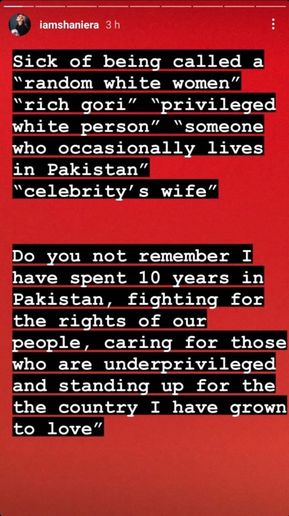 “Sick of being called a random white woman, rich gori, privileged, white person, someone of occasionally lives in Pakistan and a celebrity’s wife,” she wrote displeasingly.