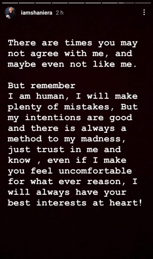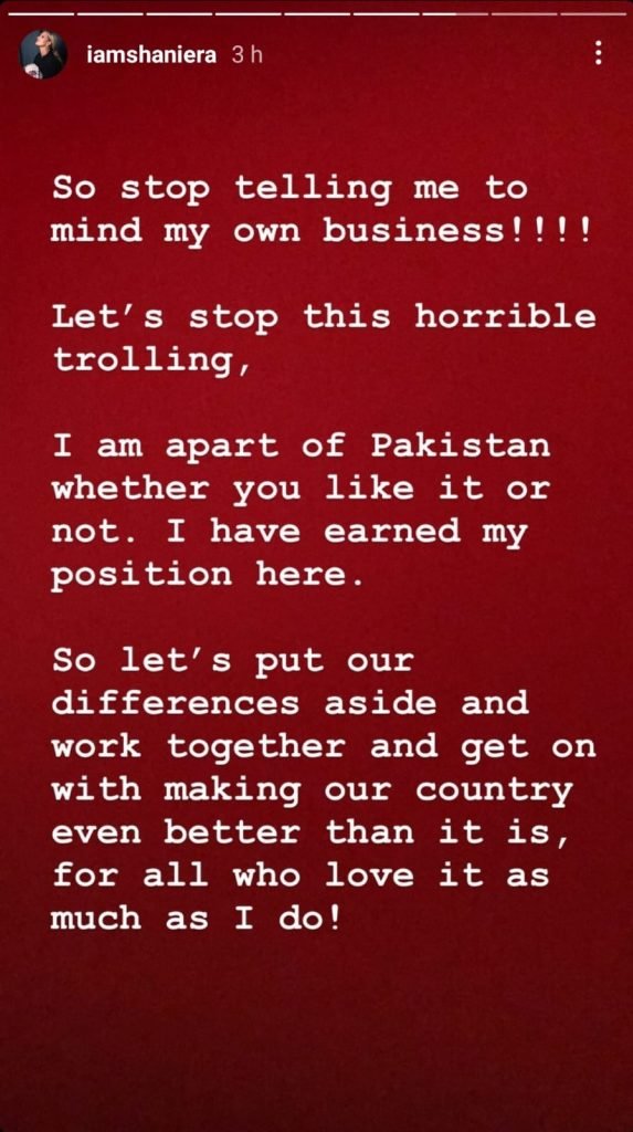 Shaniera further added, clearing that she is also a part of this country and has earned her own recognition, “Like me or not. Red my words and let them sink in. I am no random, I am Shaniera Akram. I have earned every bit of my name and I am here to stay!”