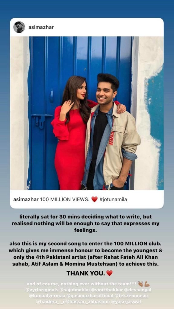 Asim Azhar has become the youngest and the fourth Pakistani artist after Rahat Fateh Ali Khan, Atif Aslam and Momina Mustehsan to enter the ‘100 million club’ after his single Jo Tu Na Mila crossed more than 100 million views on YouTube. His other song which achieved this milestone was his duet with Momina Mustehsan for Coke Studio 9: Tera Woh Pyaar.