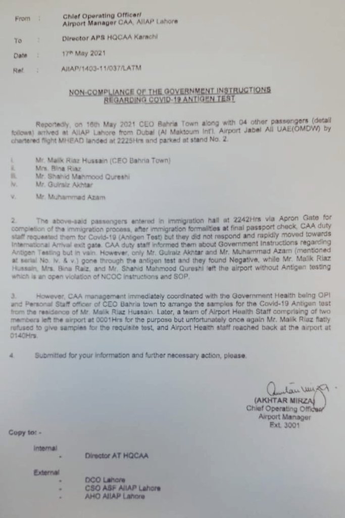 Riaz, Bina Riaz and Shahid Mahmood Qureshi, “left the airport without [the test] which is an open violation of NCOC instructions and SOPs”, the letter added.