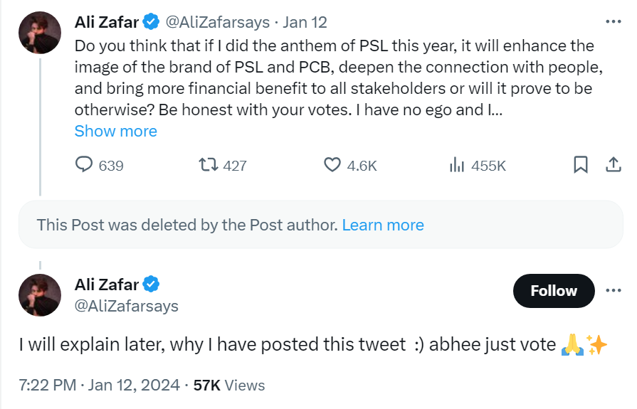 On January 12, Zafar posted on X (formerly Twitter), asking if an anthem by him will “enhance the image of the brand of PSL and PCB, deepen the connection with people, and bring more financial benefit to all stakeholders or will it prove to be otherwise?”.