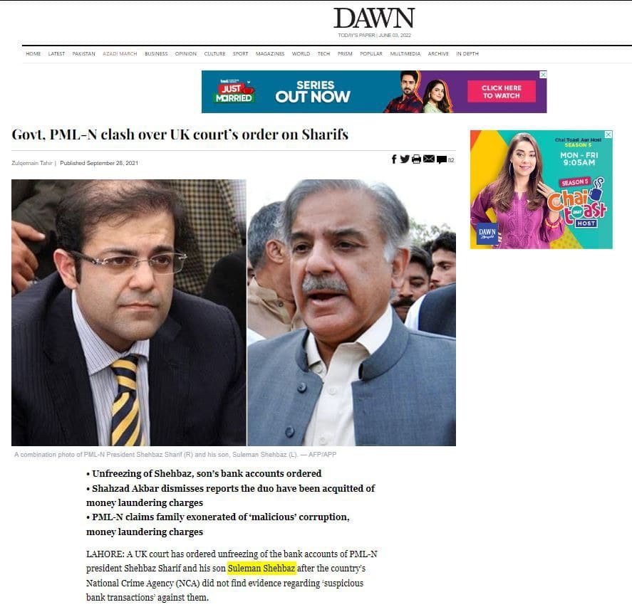 Dawn, in a story published on September 28, 2021, while writing about the premier’s son wrote, “A UK court has ordered unfreezing of the bank accounts of PML-N president Shehbaz Sharif and his son Suleman Shehbaz after the country’s National Crime Agency (NCA) did not find evidence regarding ‘suspicious bank transactions’ against them.”
