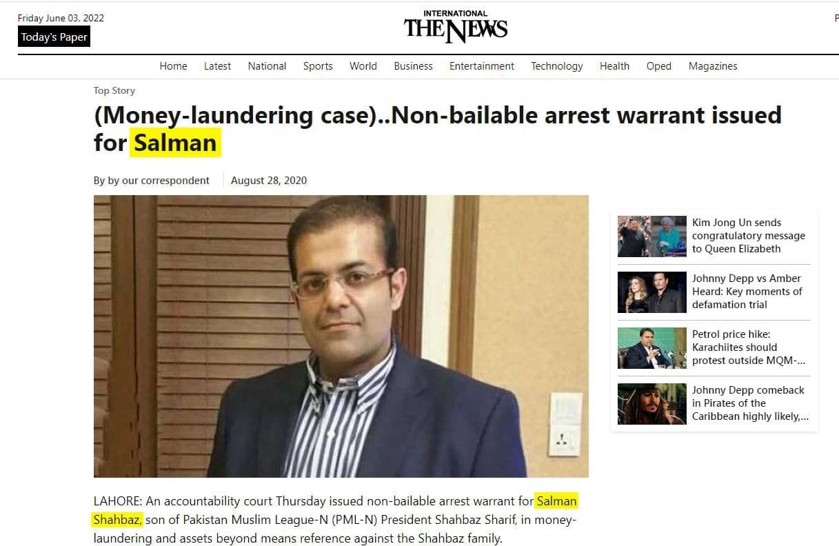Newspaper The News called the premier’s son, “Salman”. The headline read, “(Money-laundering case)..Non-bailable arrest warrant issued for Salman.”
