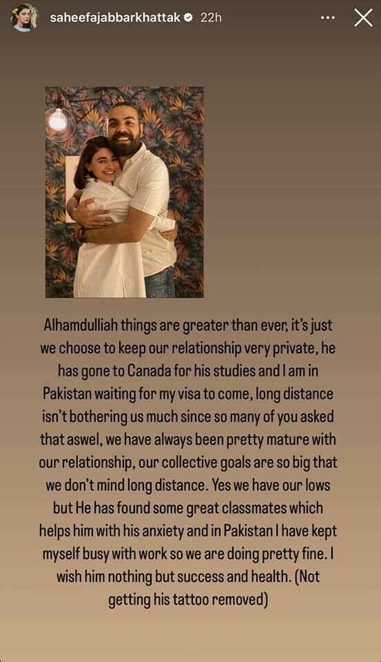 On Saturday, she shared a photo of the couple in an embrace and wrote, “Alhamdulillah, things are greater than ever, it’s just [that] we choose to keep our relationship very private. He has gone to Canada for his studies and I am in Pakistan waiting for my visa to come long distance isn’t bothering us much.”