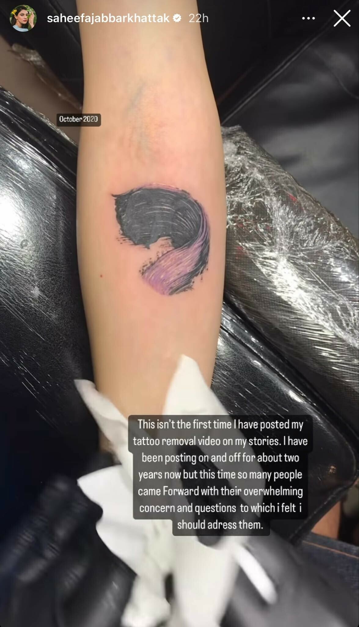“This isn’t the first time I have posted my tattoo removal on my stories. I have been posting on and off for about two years now but this time so many people came forward with their overwhelming concern and questions [so] I felt I should address them,” she wrote.