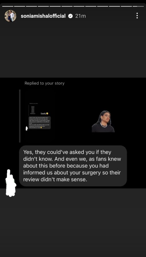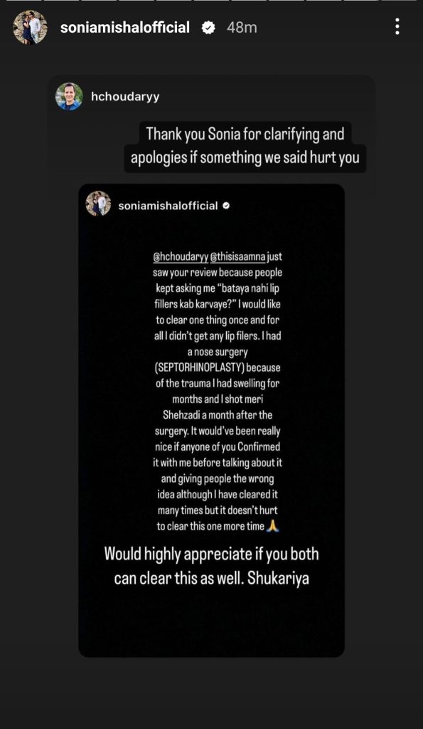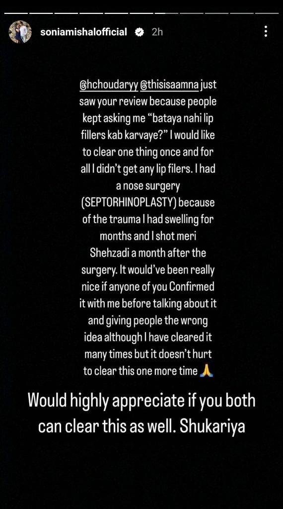 Actor Sonia Mishal took to her Instagram stories to address the rumours regarding speculation about her alleged lip fillers. The Neeli Zinda Hai diva shut down these rumours but admitted having a nose job due to medical reasons.