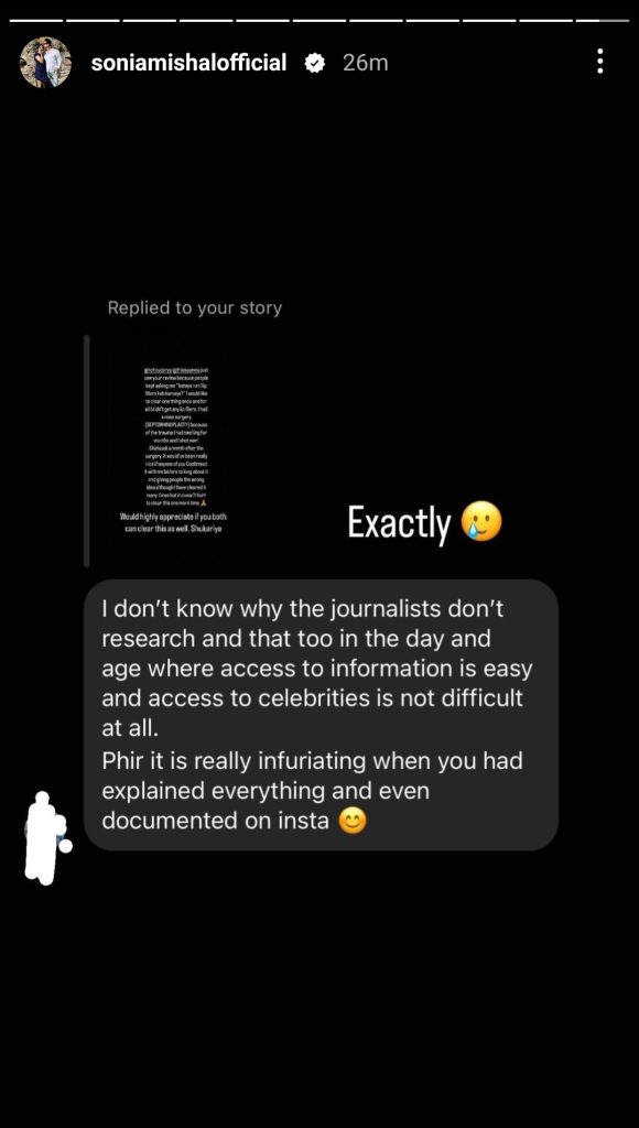 In her Instagram story, Meri Shehzadi star addressed all the queries regarding the modifications in her facial features.