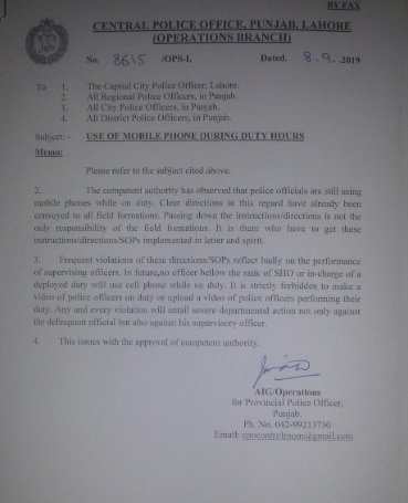 A notification sent by the additional inspector general on behalf of the Punjab Inspector General of Police Arif Nawaz to all Punjab police officers stated that it had been observed that police officials were using mobile phones while on duty even though “clear directions in this regard have already been conveyed to all field formations”. It added that it was the responsibility of the field formations “to get these instructions/directions/SOPs implemented in letter and spirit.”