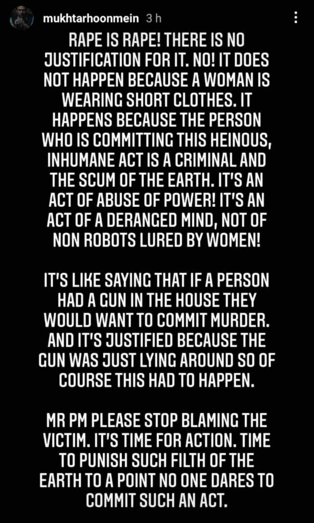 Taking to his Instagram stories, Usman Mukhtar said that rape is rape! there is no justification for it. “It does not happen because a woman is wearing short clothes. It happens because the person who is committing it this heinous, inhumane act is a criminal and the scum of the earth,” said Mukhtar.