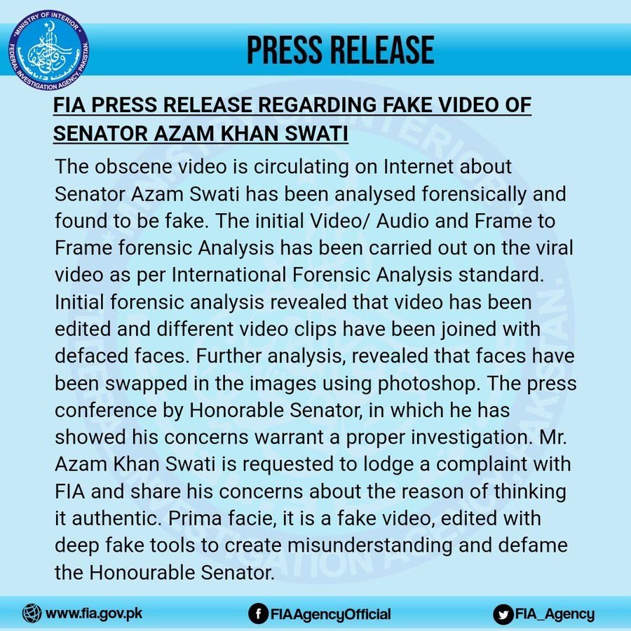 The Federal Investigation Agency has released a press release stating that the obscene video of PTI Senator Azam Swati is “fake”.