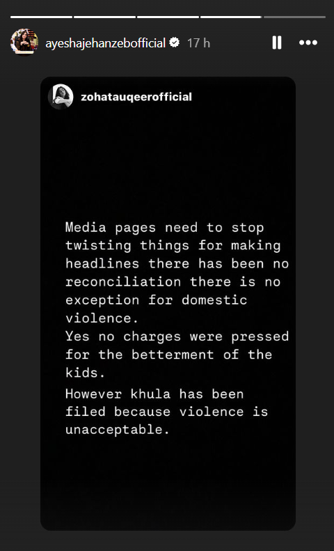 As the news spread, Ayesha’s eldest daughter, Zoha Touqeer, posted on her Instagram story that “no charges were pressed for the betterment of kids”. She denied any reconciliation attempt and informed that Khula has been filed because violence is unacceptable.