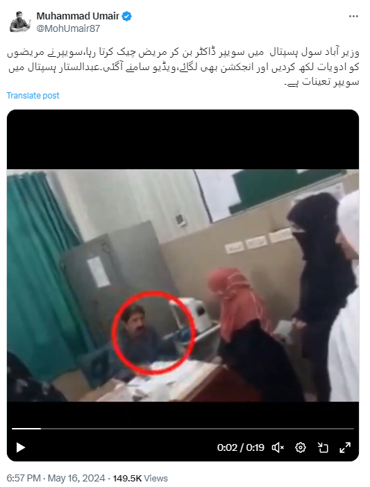 The user stated that the man checking the patients is actually a sweeper employed at the Wazirabad Tehsil Headquarters (THQ) Hospital in Punjab and pretending to be a doctor.