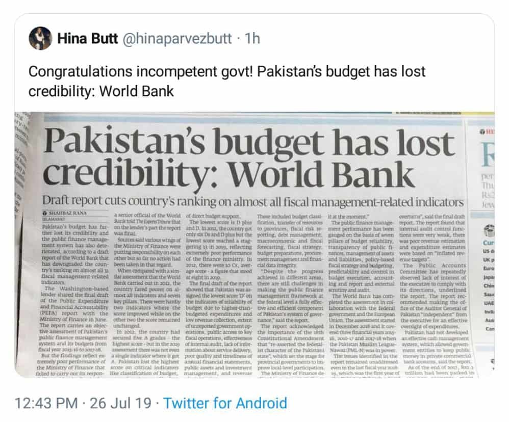 According to a draft report by the WB, Pakistan’s budget has lost its credibility and the public finance management has further weakened.