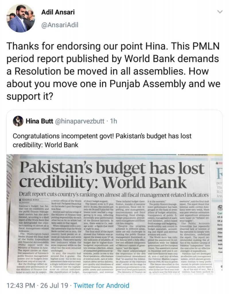 The catch, however, is that the report assesses Pakistan’s public finance management system and an analysis of its annual budgets from 2015 to 2018 — a time period when the PML-N was in power.