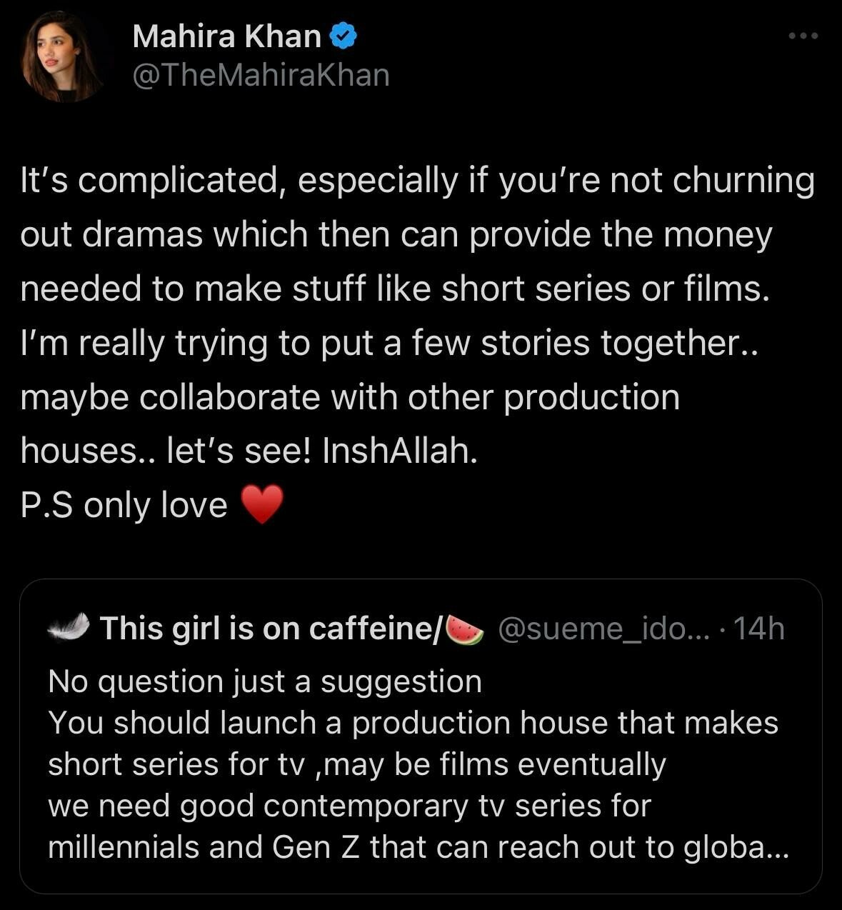 A fan suggested to Mahira, “You should launch a production house that makes short series for tv, may be films eventually we need good contemporary tv series for millennials and Gen Z that can reach out to global audience too more than current tv.”