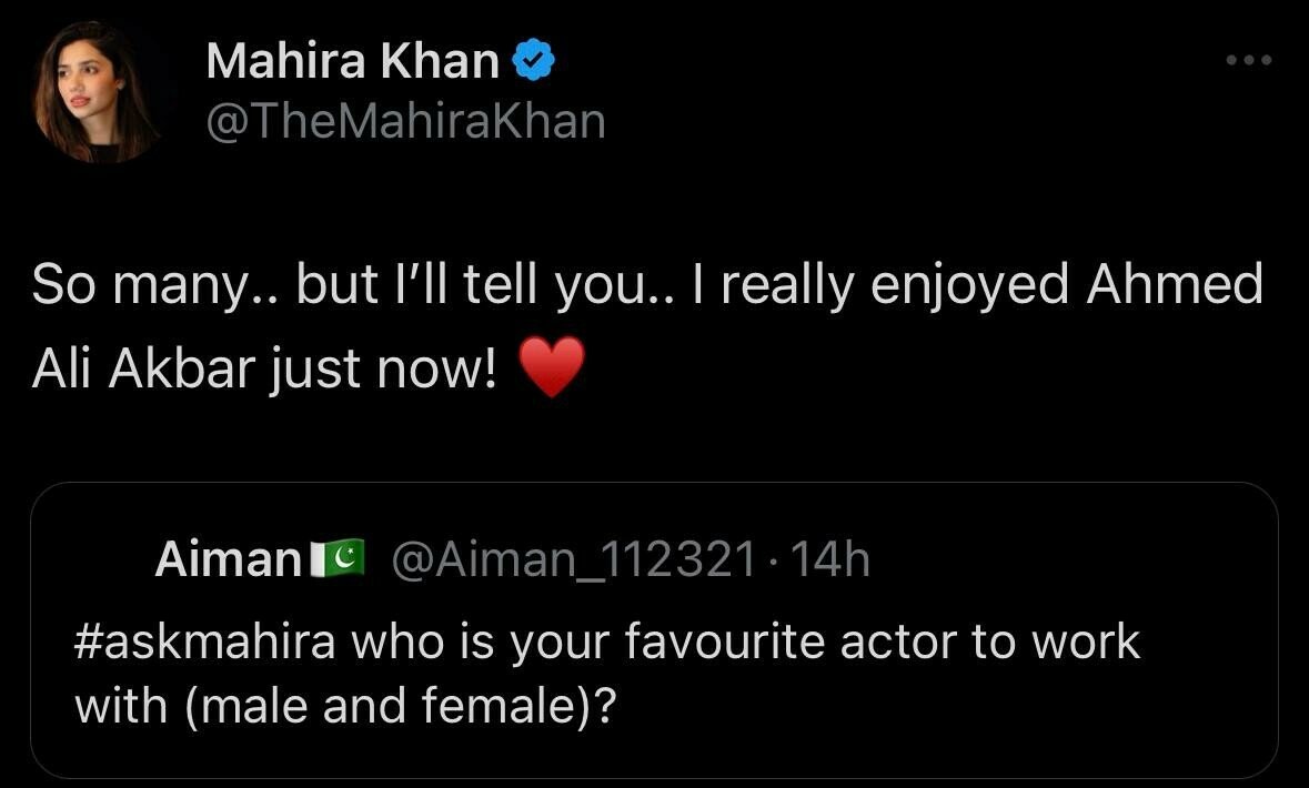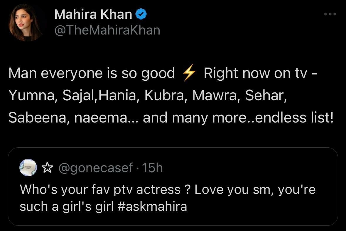 In response to a question about her favorite actress on television, Mahira Khan said, “Man everyone is so good ⚡Right now on tv- Yumna, Sajal, Hania, Kubra, Mawra, Sehar, Sabeena,naeema… and many more. Endless list.”