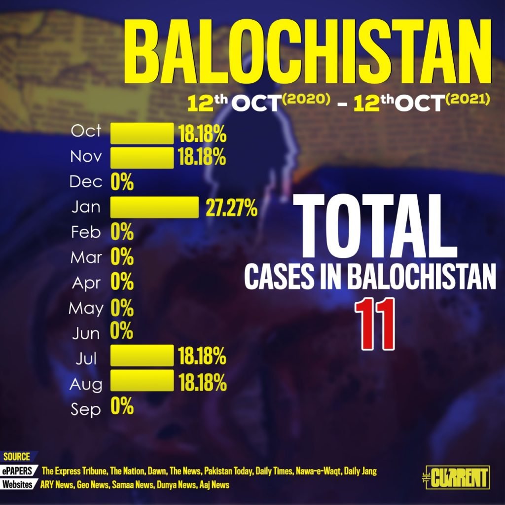 Balochistan has reported a total of 11 reported rape cases. Most of the months show zero reported rape cases, according to the graph.