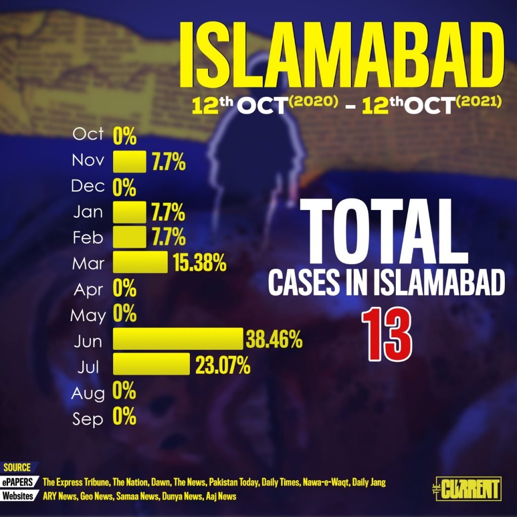 On July 20, Noor Mukadam, daughter of former Pakistani diplomat Shaukat Mukadam, was raped, beheaded and murdered, in a posh neighbourhood of Islamabad in July. Noor’s murder led to nationwide protests. After her murder, as per the reported cases we have monitored, there was an increase of 12.6 per cent in the month of August.