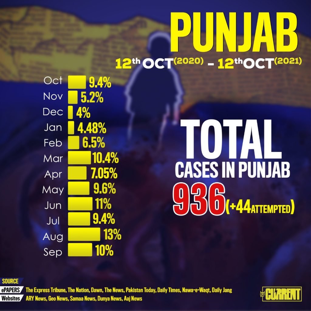 During the process, we have included reported rape cases of girls, boys, women, men and transgenders. Moreover, we have divided the rape cases province-wise, according to which Punjab till date has the highest number of rape cases, i.e. 936 rape cases and 44 attempted incidents.