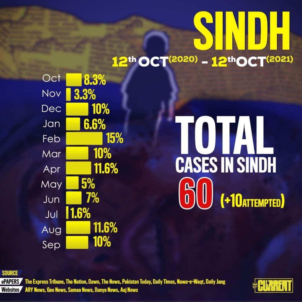 Till date, Sindh has recorded a total of 60 reported rape cases in which 10 are attempted incidents. 11.6 per cent of cases were reported in the month of April and August as per the graph.