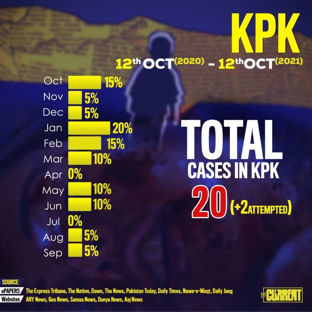 Khyber Pakhtunkhwa (KPK) has reported a total of 20 reported rape cases of which 2 were attempted incidents. The numbers throughout the months are quite the same.