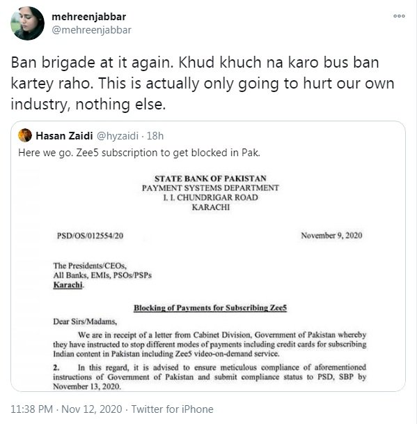 Meanwhile, Mehreen Jabbar, who directed Eik Jhoothi Love Story – another original web series for the platform – expressed her disappointment over the ban.