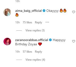 Fellow female celebrities Aima Baig and Zara Noor Abbas sent love to Zoya on her birthday.