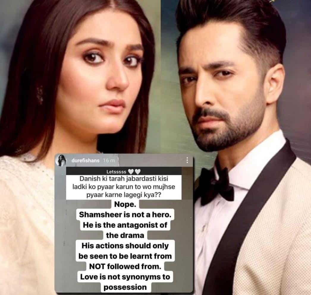 She smartly replied that Danish’s character of Shamsher is not the hero of the drama and is rather the main villain. She added that his actions are meant to be learnt from and not followed.