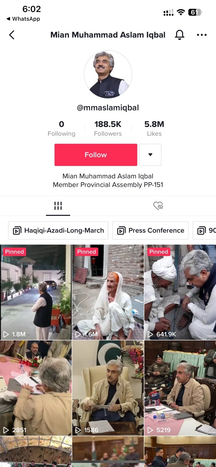 PTI’s Mian Aslam Iqbal has the most followers among politicians with 180,000 plus TikTokers following him. He uses the handle @mmaslamiqbal on TikTok.