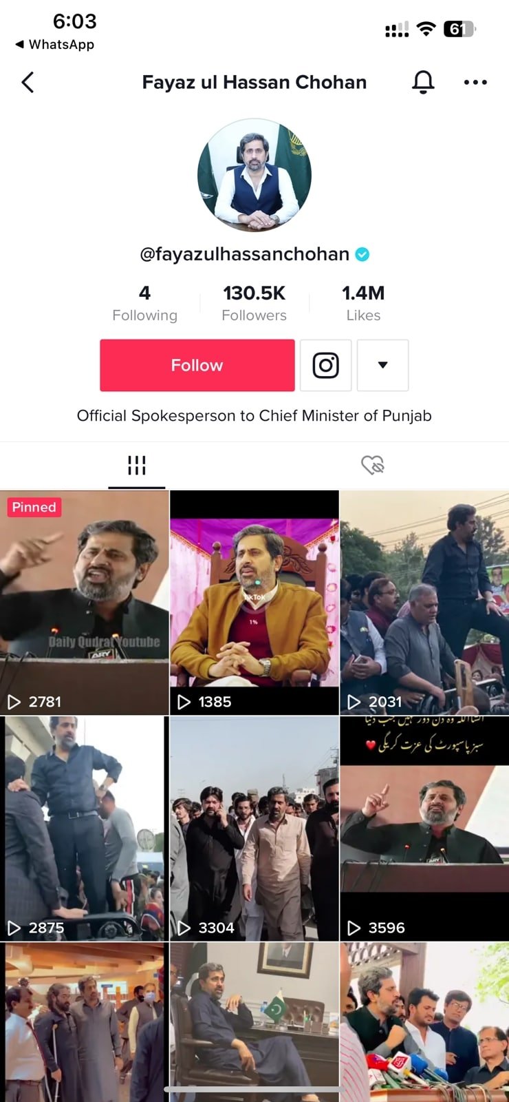 PTI’s Fayaz ul Hassan Chohan has more than 130,000 followers on Tiktok. His account handle is @fayazulhassanchohan.