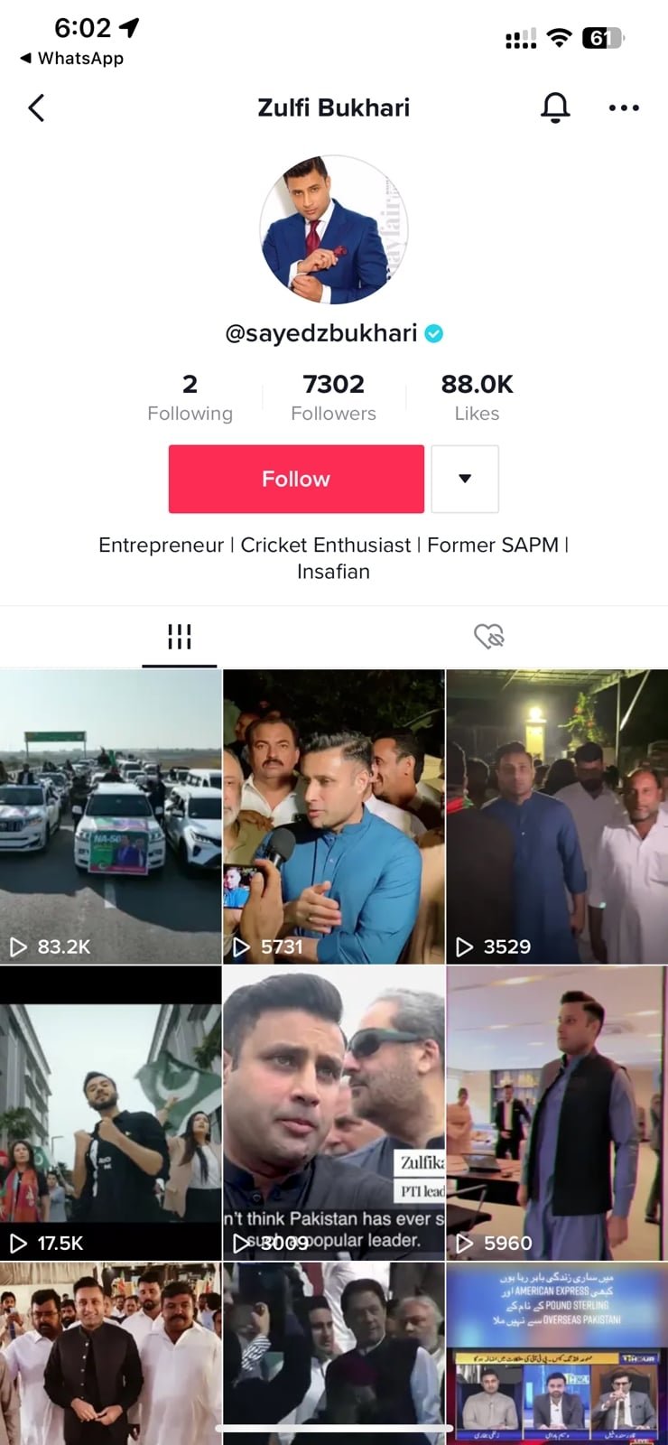 Pakistan Tehreek-e-Insaf’s (PTI) Zulfi Bukhari, with a verified account, has 7000 plus followers. He goes by the handle of @sayedzbukhari