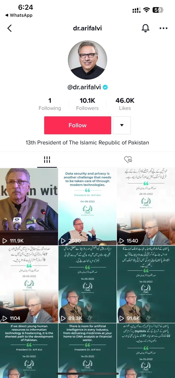 President Dr Arif Alvi has a verified account on TikTok with 10,000 plus followers. The president’s account handle is @dr.arifalvi.
