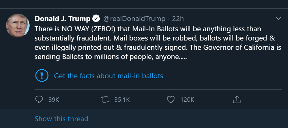 The label attached to tweets of President Trump says “get the facts about mail-in ballots,” that link leads to a collection of tweets and news articles debunking the president’s statement.