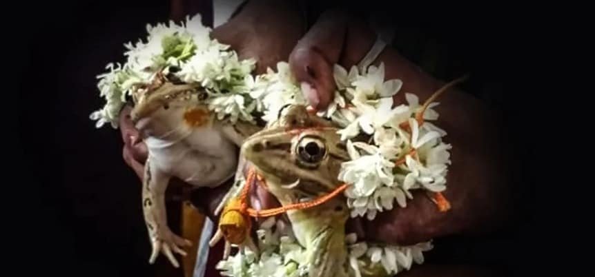 While the rest of us wait for the monsoon rains to come, citizens from the Indian state of Karnataka decided to take matters into their own hands. They got together and arranged a marriage between two frogs to appease the Hindu rain god.