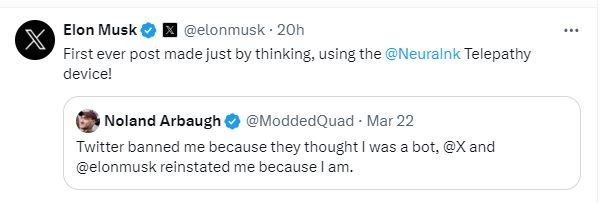 Elon Musk also shared Arbaugh’s tweet stating, “First ever post made just by thinking, using the Neuralink Telepathy device!”