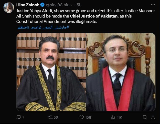 Some social media users went on to suggest that Justice Afridi should not accept the position owing to the changes in process of appointment of the country’s top judge under the 26th Amendment.