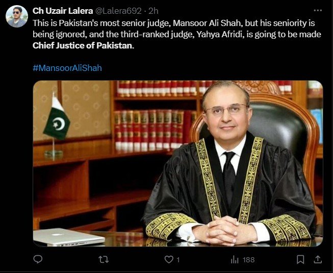 Showing concern over the appointment of the third senior-most judge instead of senior-most Justice Mansoor Ali Shah after CJP Qazi Faez Isa, another user wrote, “This is Pakistan’s most senior judge, Mansoor Ali Shah, but his seniority is being ignored, and the third-ranked judge, Yahya Afridi, is going to be made Chief Justice of Pakistan.”